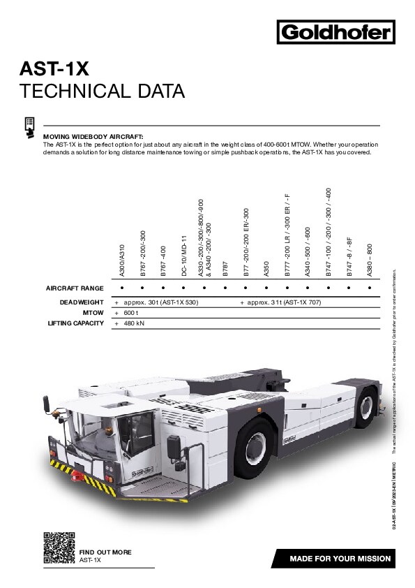 The towbarless AST-1X can taxi aircraft from A300/B767 up to A380/B747 with ease. The AST-1X is the perfect option for just about any aircraft in the weight class of 400-600 t MTOW. Whether your operation demands a solution for long distance maintenance towing or simple pushback operations, the AST-1X has you covered.