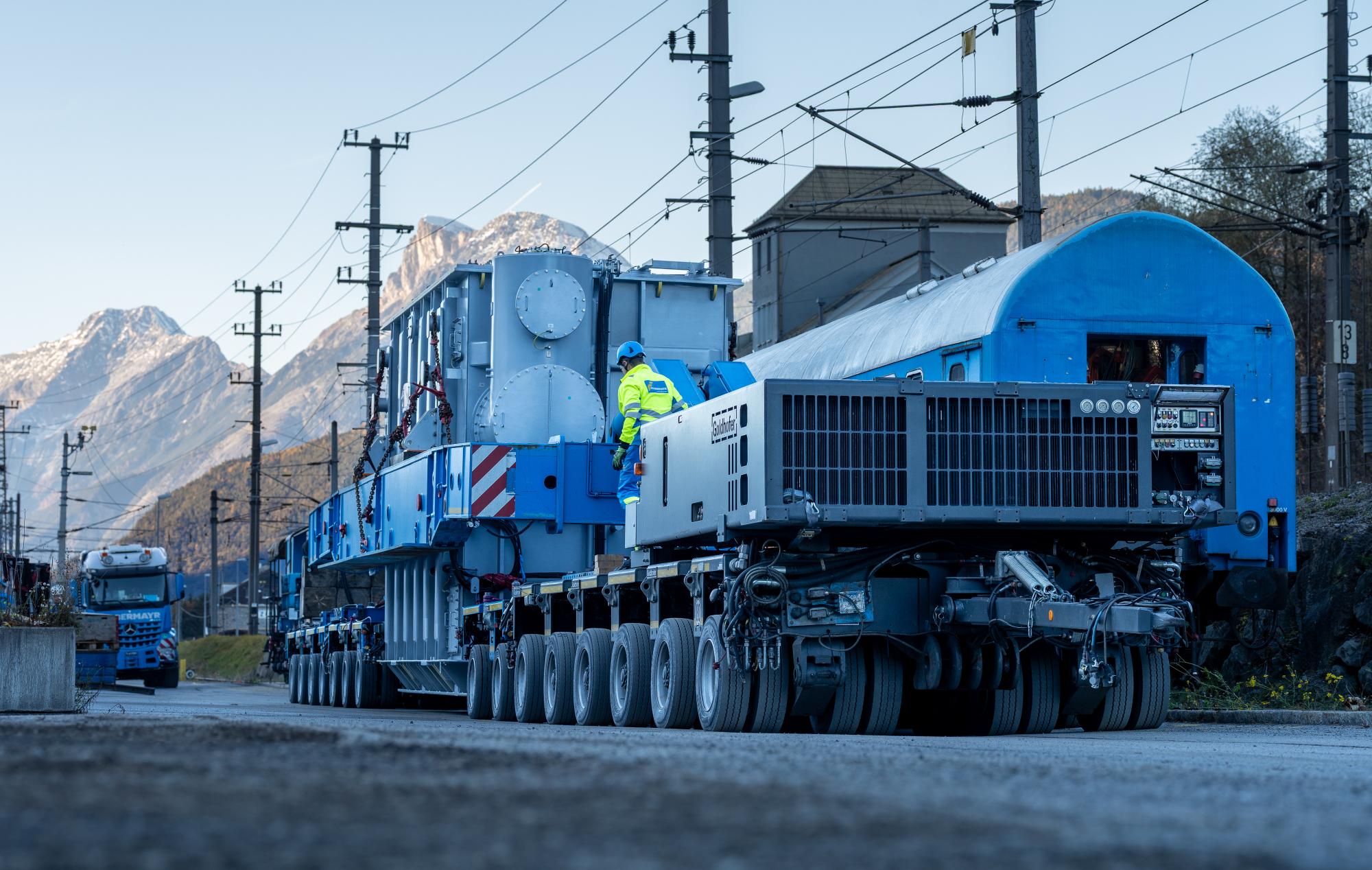 Der 140 t schwere Transformator wurde per Bahn nach Zirl transportiert und dort auf eine Schwerlast-Modul-Kombination umgeladen. Die Spezialisten von Felbermayr setzten auf eine 15-achsige Kombination: Vorne ein 6-achsiger Selbstfahrer »ADDRIVE« und ein 2-Achser der »FT SERIES« (Typ THP/FT-L), hinten eine 3+4-Kombination derselben Serie. Dazwischen trug eine Scherenhubbrücke den Transformator, montiert über eine Drehschemel-Einrichtung. Ergänzt wurde das Setup durch eine Zugmaschine und eine Schubmaschine - unverzichtbar für die steilen Passagen der Bergstrecke.